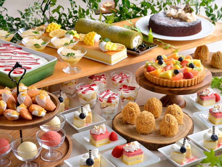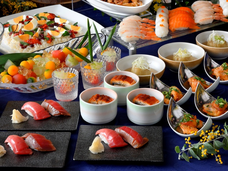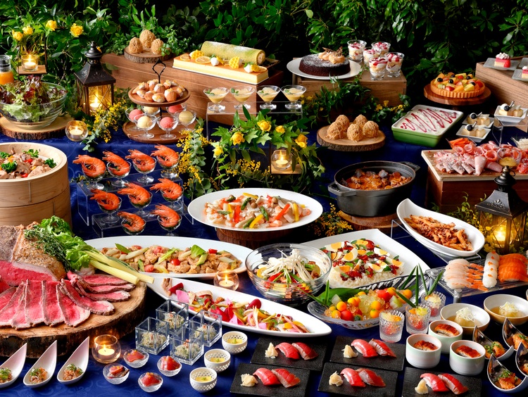 新鮮野菜を並べたサラダステーションや人気のサーロインローストビーフや握り寿司、茄子の鴫炊き、蛍に見立て仕上げた冷やし煮物、東坡肉(トンポーロー)など、和・洋・中が揃う贅沢なラインナップ。さらに今年はライブキッチンに、目の前でチーズを削り仕上げる海老の出汁香るソースのパスタと、ミートソースパスタが登場。そのほか、目の前で仕上げる栗のモンブランや華やかなデザートなど、爽やかな季節にふさわしい品々をご用意しました。